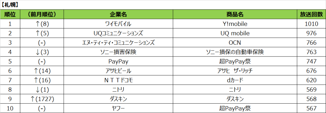 特筆すべきは、4位と10位にランクインした「超PayPay祭」です。CM出稿企業はPayPayとヤフーの2社になります。クリエイティブは、ポイント還元やプレゼントなどを紹介するPayPayのバージョンとヤフーとLINEの統合記念キャンペーンのように出稿企業により異なりましたが、2社合計の「超PayPay祭」の放送回数は7000回以上となり、3月度のテレビCMの世界ではとても目立つ結果となりました。
