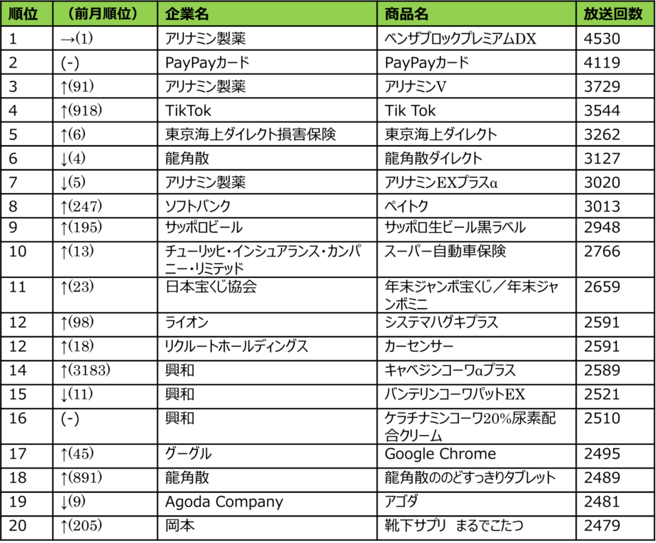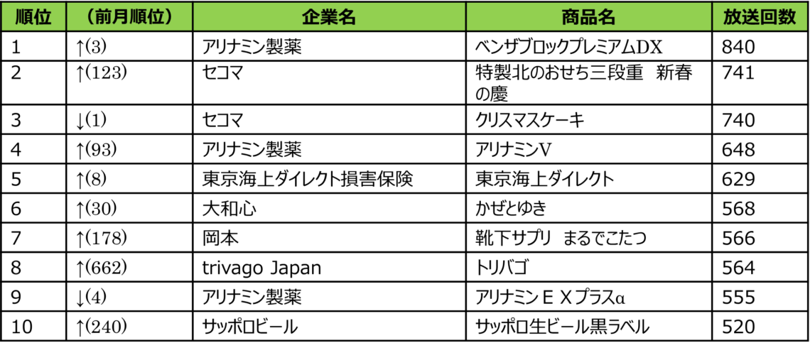 テレビCMメタデータシステムを活用した2025年12月度の主要5大都市圏※(地上波25局、BS放送6局)で放送されたテレビCMの放送回数を調査・集計結果を下記の通りお知らせします。 ※ 5大都市圏:東京、大阪、愛知(名古屋)、福岡、北海道(札幌)