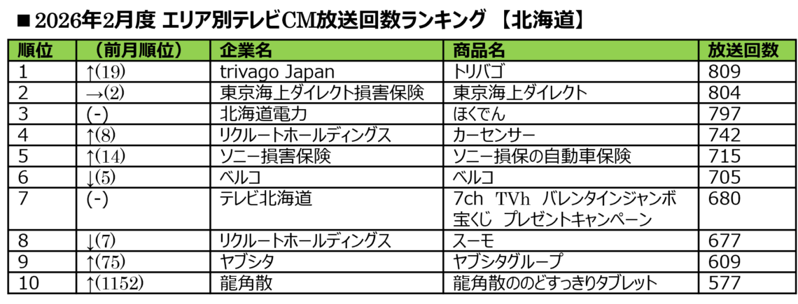 このたび、テレビCMメタデータシステムを活用し、2026年2月度の主要5大都市圏※(地上波25局、BS放送6局)で放送されたテレビCMの放送回数を調査・集計結果を下記の通りお知らせします。 ※ 5大都市圏:東京、大阪、愛知、福岡、北海道