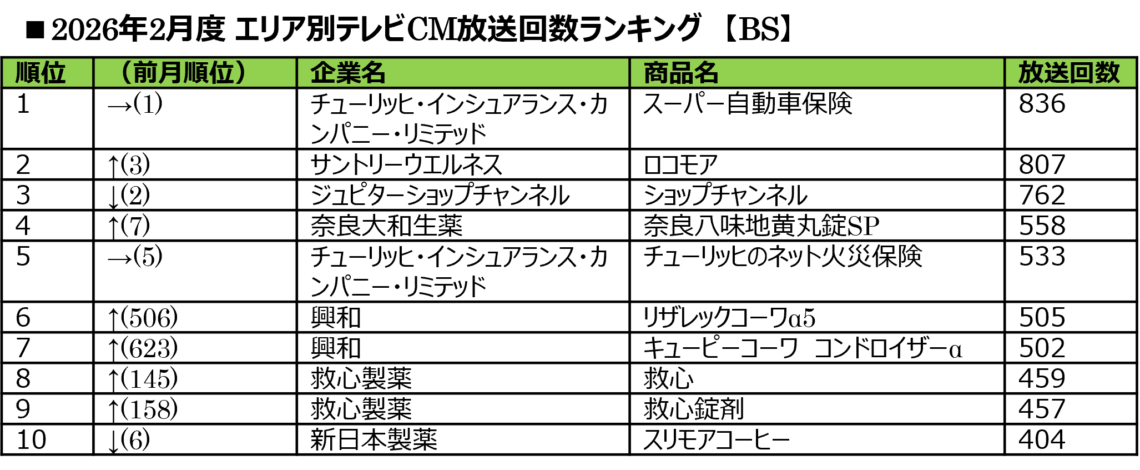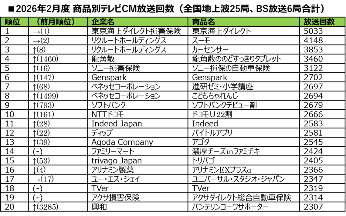 ■2026年2月度 商品別テレビCM放送回数ランキング
