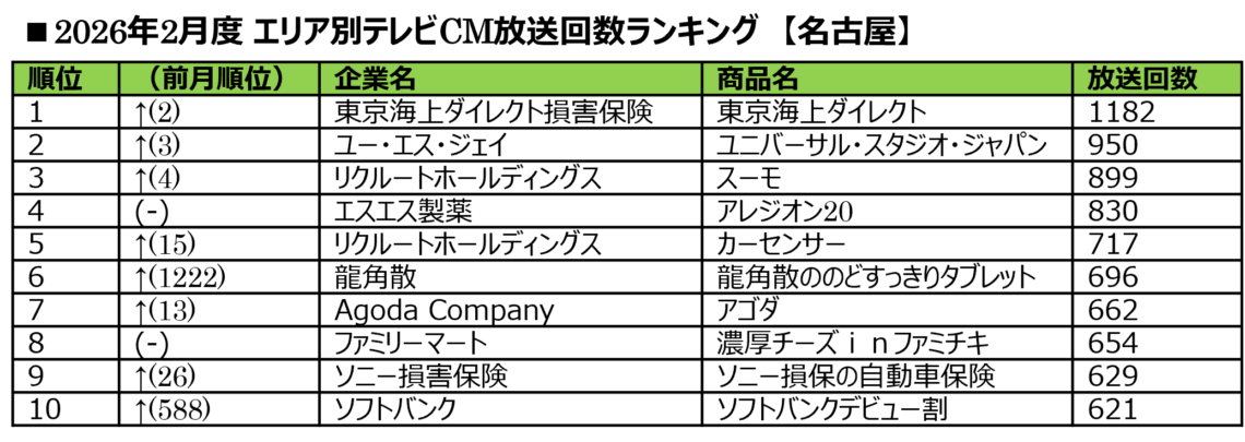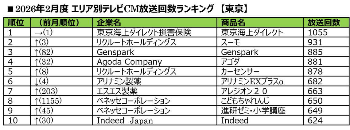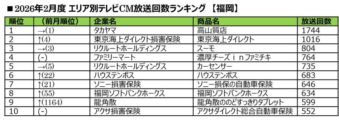 ■2026年2月度 エリア別テレビCM放送回数ランキング
