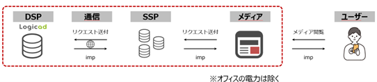 計測範囲: DSP・SSPそれぞれのサーバー処理、ネットワーク通信、およびメディアでの広告表示において発生する二酸化炭素排出量を算定します。※計測可能DSPは、Logicad、TVBridgeとなります。