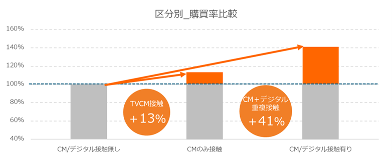 特筆すべきは、テレビCMに加え、TVer等の動画メディアでデジタル広告を重ねて接触させることで、購買率(※2)の増加幅がテレビ単体の約3倍に跳ね上がった点です。 これは、多くの生活者がテレビで広く商品を「認知」し、デジタルのターゲティング広告で「自分ごと化」することで、最終的な「購買」に至るという勝ちパターンがデータとして実証されたことを意味します。