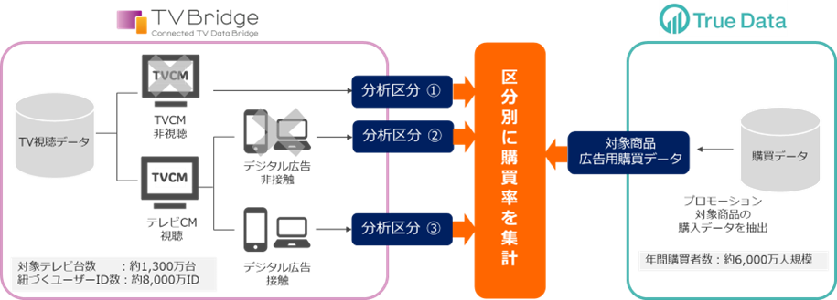 その一環として、ドラッグストアやスーパーマーケットにおける約6,000万人の購買データ(POS、ID-POS)を扱うTrue Dataと連携し、テレビCMとデジタル広告の重複接触が購買に与える影響を分析~可視化できるソリューションを提供しています。